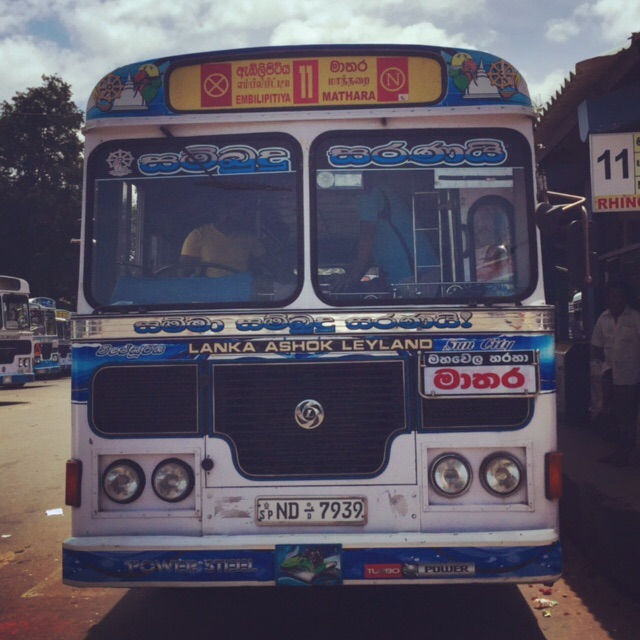 What a bus in Sri Lanka looks like. Not the bus to Sigiriya/Dambulla from Kandy but usually (but not always) has the start/end of the route on the top of the bus. Buses often make many local stops and blast Sri Lankan and Bollywood pop music the entire way.