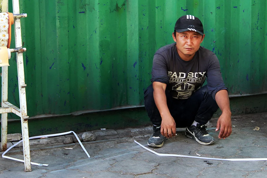 A man taking a smoke break at Dordoy Bazaar in front of one of the many shipping containers.